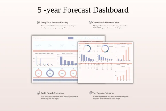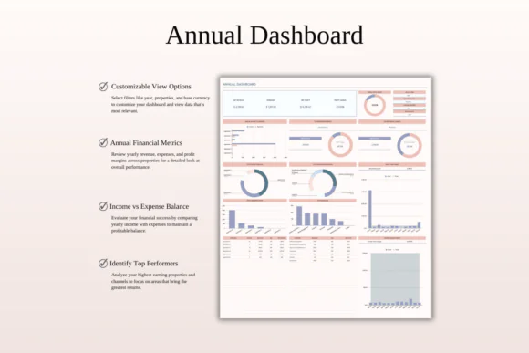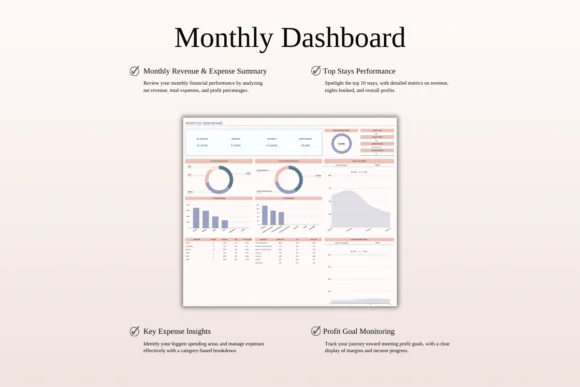 The template includes a multi-layer smart dashboard, property-specific dashboard, monthly rental dashboard, annual dashboard, custom and comparison dashboards, 5-year forecast dashboard, ROI calculator, and tax report. These sections help you analyze each property’s performance, compare income vs. expenses, identify top-performing months, review booking channels, manage profit goals, control expense budgets, and plan long-term growth.