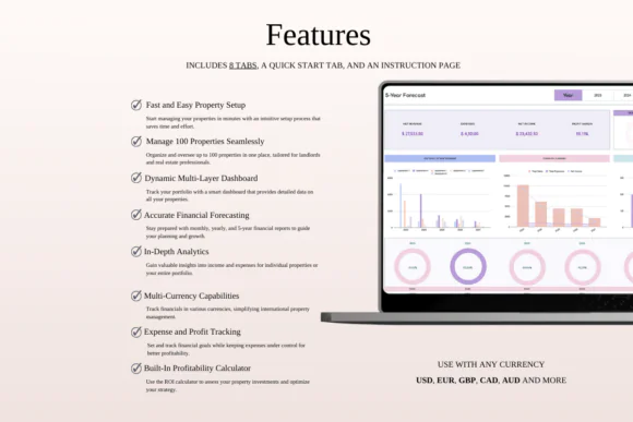 Compatible with both Microsoft Excel and Google Sheets, this rental property tracker is suitable for online or offline use and can be accessed from Mac, PC, phone, or tablet.