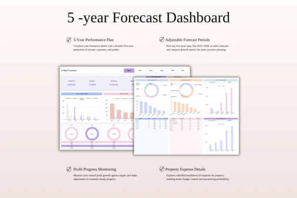 Plan long-term rental property growth with a 5-year projection dashboard that helps you visualize future income, expenses, profit, and business direction.