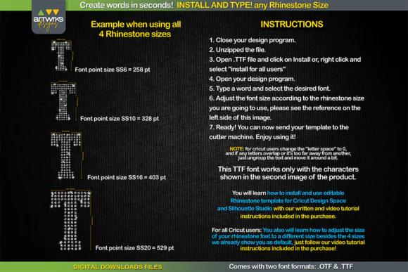 This digital font template allows you to simply install the font, open your preferred design software, type any word, and create rhinestone-ready lettering in seconds. Each letter is designed to be filled with rhinestone placement points or arranged for heat transfer vinyl use, making it a useful tool for crafters, apparel sellers, Cricut users, Silhouette creators, small business owners, and custom merch designers.