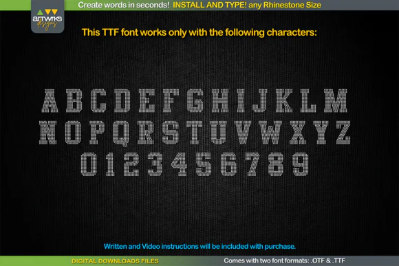 Create custom rhinestone text designs quickly and easily with RS02 Atletico TTF Rhinestone Template Font, a typeable rhinestone font designed for making professional crystal-style words, sports apparel, hotfix transfers, heat transfer vinyl designs, and personalized t-shirt graphics.