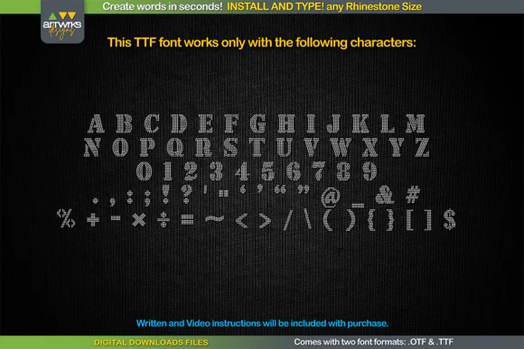 Create sparkling custom text designs in seconds with RS03 Seal Bold Rhinestone Template TTF Font, a bold typeable rhinestone template font made for crystal hotfix transfers, bling lettering, heat transfer vinyl projects, and custom apparel designs. This digital font allows you to simply install the font, type any word, adjust the size, and create rhinestone-ready lettering for your craft or business projects.