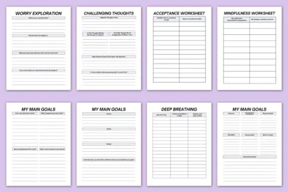 Belongs To Pages, My Personal Crisis Plan, My Talk Log, Reasons for Living, Patient Safety Plan, My Safety Plan, My Safety Tracker, Anxiety Log, Forgiving Yourself, Self-Care Checklist, Self-Care Goal, Favorite Affirmation List, Self-Care Track, Challenging Thoughts, Worry Exploration, Mindfulness Worksheet, Acceptance Worksheet, My Main Goals, Deep Breathing, Problem Solving, Coping Step, Goal Setting, Mental Health Checklist, Positive Thoughts, I’m Grateful, My Note, Thank You Page, and more.