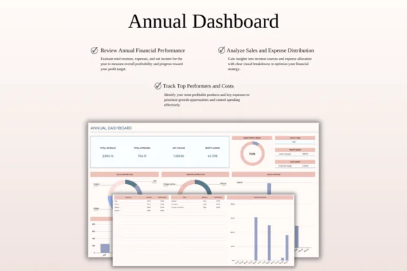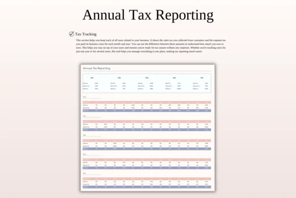 The monthly and annual dashboards help you understand your business performance clearly, while the 5-year analytics view gives you a bigger picture of growth. With customizable categories, multi-currency support, and tax reporting tools, this spreadsheet is practical for both new and growing businesses.