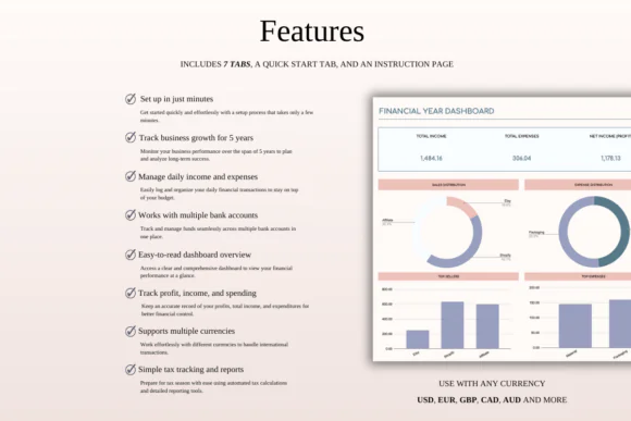 The template includes income and expense trackers, profit and loss tracking, accounting ledger support, sales tax tracking, multi-bank account support, multi-currency conversion, monthly dashboards, annual dashboards, financial year summaries, global tax reporting, and a 5-year business growth dashboard.