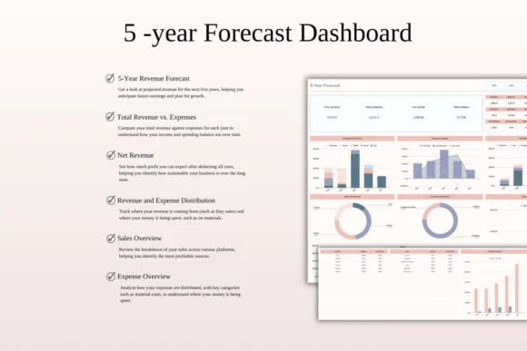 Analyze long-term business performance with a 5-year dashboard. View revenue, expenses, net income, profit trends, and business growth over time.