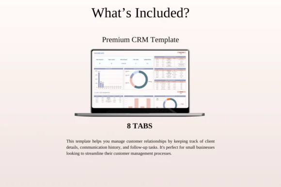 The bundle includes a Small Business Bookkeeping Spreadsheet to track financial transactions, a detailed Income and Expense Tracker to monitor cash flow and spending patterns, a Premium CRM Template to manage customer relationships and follow-ups, and a Net Worth Tracker to monitor business assets, liabilities, and equity.