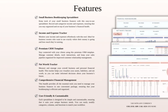 The Small Business Finance & Bookkeeping Spreadsheet Bundle is a complete and easy-to-use financial organization toolkit for business owners who want more control over their money and customer relationships. With bookkeeping, income tracking, expense planning, CRM management, and net worth tracking included, this bundle helps you manage your business with clarity, confidence, and better financial structure.