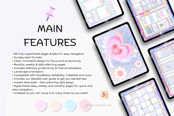Use it for daily, weekly, and monthly planning, goal setting, checklists, trackers, and personalized organization based on your needs. The original listing mentions compatibility or editing support for GoodNotes, Notability, Samsung Notes, and Xodo. Product details mention 68 pages, giving you a solid amount of content to work with. File formats mentioned in the source include PDF.