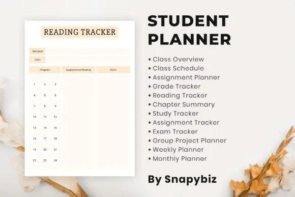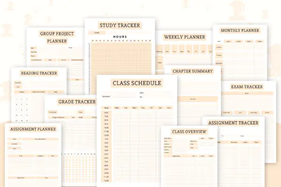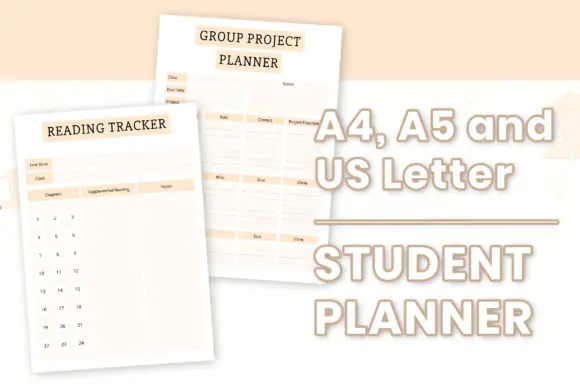 Student planner, study tracker, reading tracker, group project planner, weekly planner, class schedule, chapter summary, monthly planner, exam tracker, plus 12 printable planning pages in total.