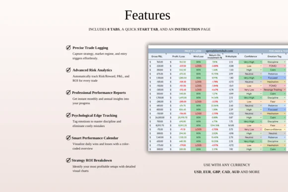 With this journal, you can record each trade from entry to exit, document your strategy, add trade notes, review setup details, and understand how your trades perform over time. It helps you stay organized, reduce emotional decision-making, and focus on data-driven improvement by giving you a clear view of your trading history and results.
