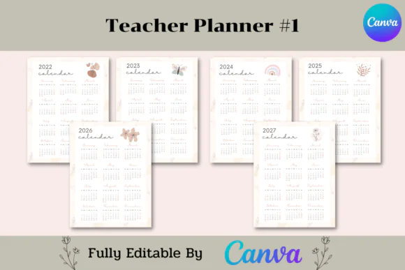 This teacher planner kit includes 40 page templates covering a wide range of classroom and teaching essentials. Inside, you’ll find pages such as cover pages, about me, teacher contact list, student contact list, class snapshot, class birthdays, classroom inventory, yearly goals, SMART goals, important dates, to do list, timetable, year plan sheet, monthly plan sheet, semester plan page, term plan page, weekly plan sheet, lesson plan, daily plan sheet, attendance record page, assessment page, group pages for reading, writing, math, and science, helpful hints, classroom volunteers, professional learning, and notes. It also includes calendar pages for 2022, 2023, 2024, 2025, 2026, and 2027.