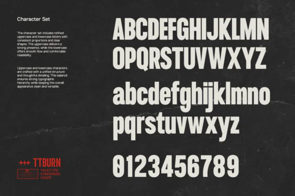 TRT Burn Font is ideal for branding, headlines, editorial design, advertising, posters, packaging, website layouts, UI design, web interfaces, digital products, social media graphics, promotional banners, product labels, magazine layouts, business presentations, and modern print materials. Its condensed construction allows you to fit more content into tighter spaces without losing legibility, making it especially useful for space-conscious layouts and structured brand systems.