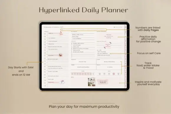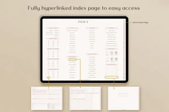 This planner includes daily, weekly, and monthly planning pages, along with Sunday and Monday start options, giving you flexibility to plan in the way that suits you best. It contains 600 pages in landscape mode, plus 5 custom notes pages with hyperlinked tabs and an index page linked to all lifestyle planning pages for faster access.