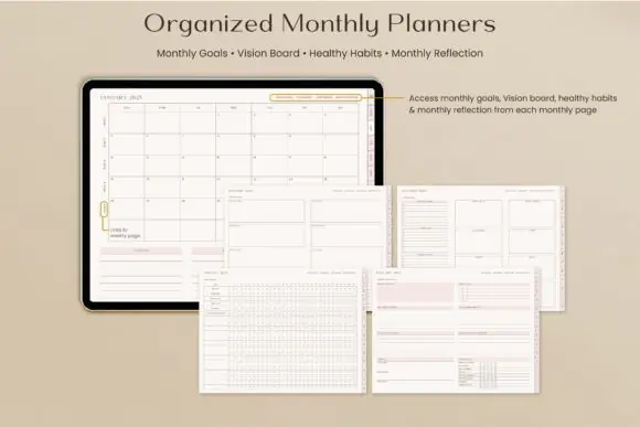 Inside, the planner includes a complete range of sections for lifestyle, wellness, health and fitness, productivity, finance, dashboard planning, and notes. You’ll receive a full-year 2025 digital planner with 12 monthly pages, 52 weekly pages, and 365 daily pages, along with year-at-a-glance pages for calendar, important dates, yearly reflection, and quarterly planning.
