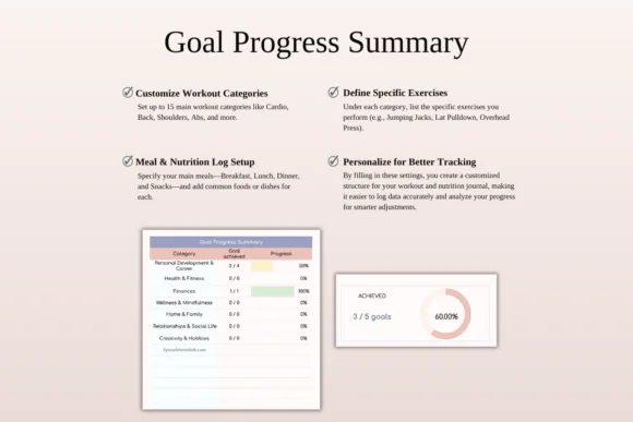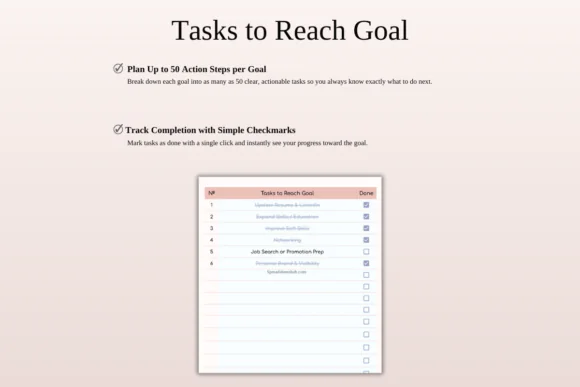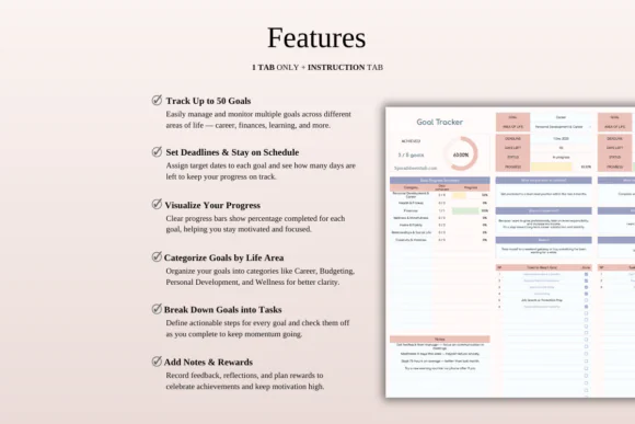 The automatic progress tracking keeps you motivated, the deadline countdown helps you stay focused, and the task breakdown system makes even big goals feel manageable. Whether you are working toward one major life goal or managing many smaller goals, this spreadsheet gives you a clean and practical system for staying organized.