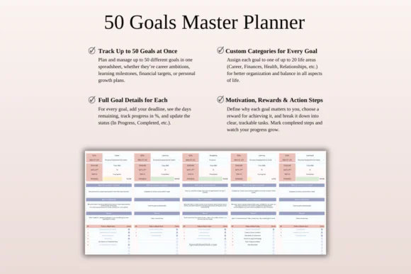 Whether you are planning personal goals, business goals, career goals, study goals, fitness goals, financial goals, creative projects, or lifestyle improvements, this spreadsheet gives you a structured system to turn big ideas into manageable actions. Instead of keeping goals only in your mind or writing them as a simple list, this planner helps you create a real action plan with categories, deadlines, countdowns, priorities, tasks, rewards, and progress tracking.