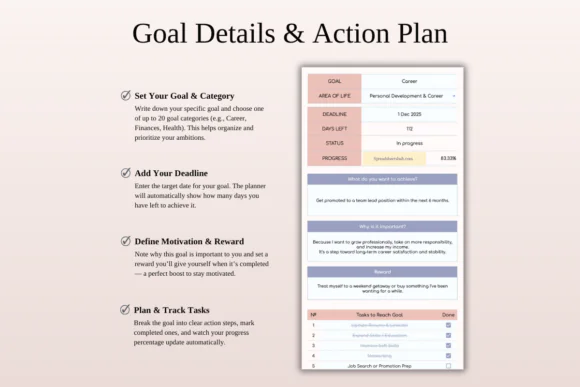 This planner helps you move beyond vague goal setting and into clear execution. You can define what you want, why it matters, when it should be done, and what steps are needed to complete it.