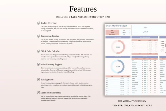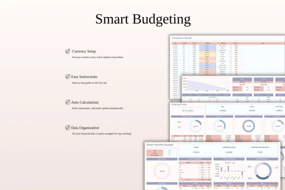 This budget spreadsheet includes automatic calculations, customizable categories, multi-currency support, bill and debt tracking, financial goal tracking, sinking funds, and a step-by-step setup guide. It is suitable for personal budgeting, family finance planning, freelancers, side hustlers, and even small business cost tracking.