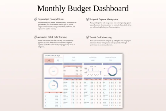 This template helps make monthly budgeting less overwhelming by placing everything in one clear system. You can track income, expenses, bills, savings, debts, and goals without switching between multiple planners or apps.