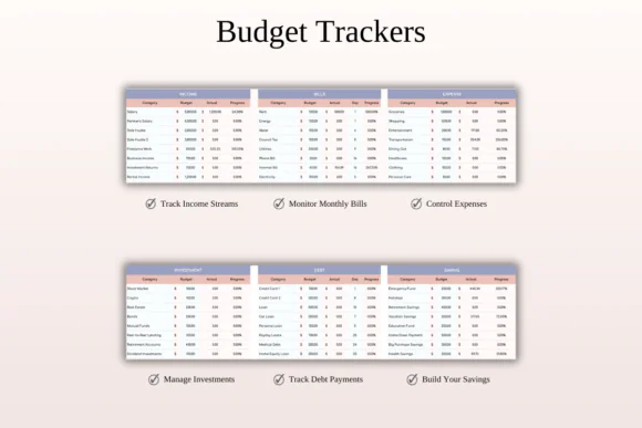 Track income, expenses, bills, savings, debts, and financial goals in one organized spreadsheet. This helps you avoid using multiple separate files for different money tasks.