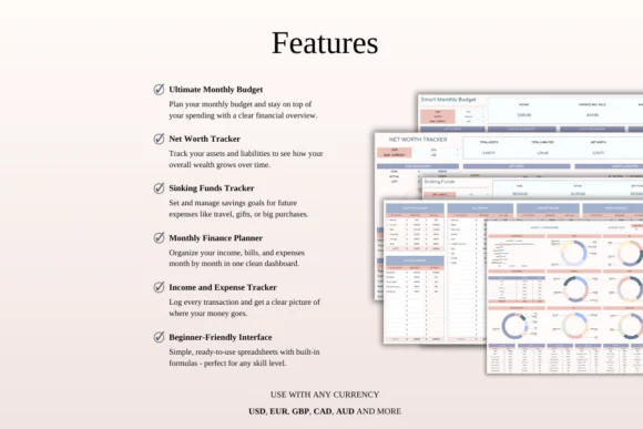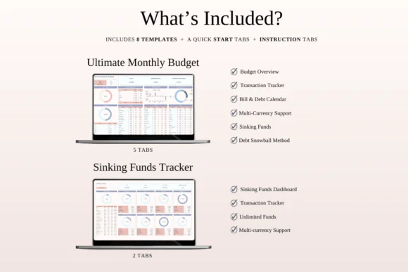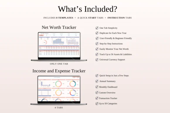The bundle includes 5 pre-designed finance spreadsheets, including a monthly budget spreadsheet, net worth tracker, sinking funds tracker, budget planner, and income and expense tracker. These templates work together to help you plan your monthly finances, track daily transactions, prepare for future expenses, review your overall financial position, and stay focused on your money goals.