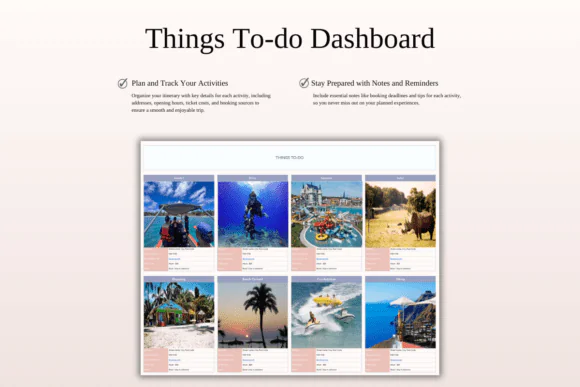 The template includes multiple useful dashboards such as a Research Dashboard, Travel Budget Dashboard, Task List Dashboard, Daily Planner Dashboard, Things to Do Dashboard, Packing List Dashboard, and Overview Dashboard. These sections help you research your destination, track bookings, plan daily activities, control your travel budget, prioritize attractions, and make sure you do not forget important items before departure.