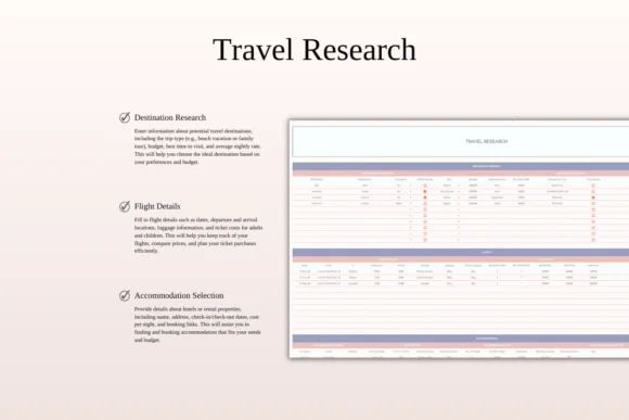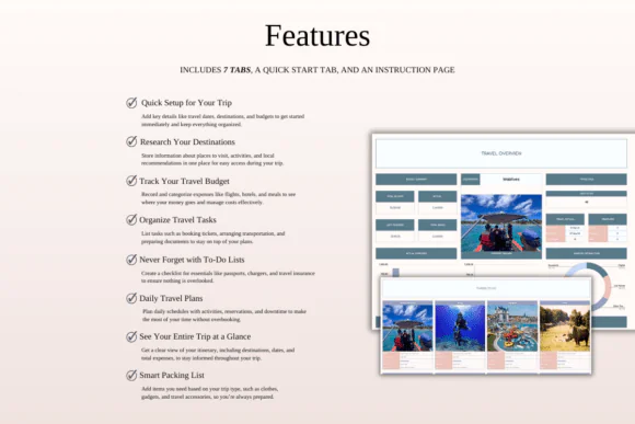 The Ultimate Travel Planner Spreadsheet is a practical and easy-to-use trip organization tool that helps you plan smarter, stay on budget, and enjoy a smoother travel experience. With dashboards for budgeting, itinerary planning, research, tasks, packing, and activities, this template gives you everything you need to turn your travel ideas into a well-organized journey.