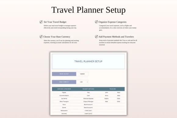This spreadsheet is editable in both Microsoft Excel and Google Sheets, making it flexible and easy to use on Mac, PC, tablets, or phones. It includes sample versions with mock data and blank versions so you can learn how the planner works before entering your own travel details.