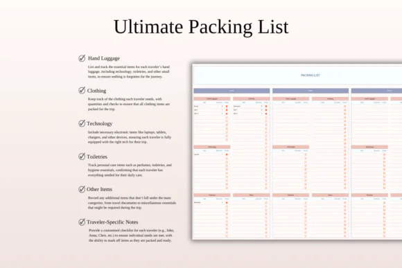 Plan your next trip with confidence using this Ultimate Travel Planner Spreadsheet for Excel and Google Sheets. Designed as an all-in-one travel planning system, this template helps you organize every part of your journey, including destinations, travel dates, itinerary details, local attractions, bookings, tasks, packing lists, and travel expenses.