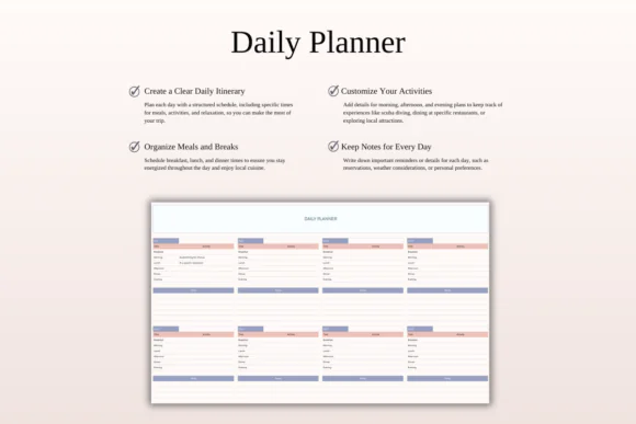 With the travel budget dashboard, you can plan and monitor your expenses so you stay within your budget while traveling. The daily planner helps you build a clear itinerary for each day, while the packing checklist keeps your travel essentials organized. The task list dashboard helps you track important actions like booking flights, accommodation, transport, tours, reservations, and other trip preparations.