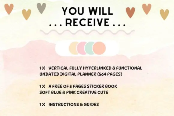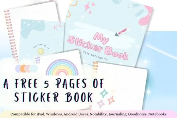 This planner comes in a vertical 11 x 8.5 inch format and includes instructions and guides to help you get started. It also includes a free 5-page sticker book in a soft blue and pink style, adding extra value for digital planning and journaling use.