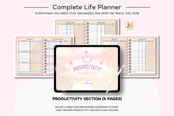 Inside, you’ll find essential planning pages such as daily planner pages for Sunday through Saturday, weekly planner, weekly self-care checklist, weekly meal tracker, and weekly vitamins and supplements pages. It also includes dedicated sections for productivity, such as a habit tracker, reading log or books to read, movies and series to watch, and daily routines. This makes it a versatile digital planner for staying focused and organized in both personal and professional life.