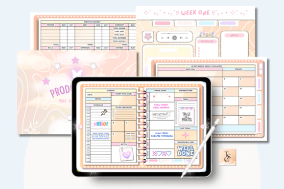 The planner also features wellness and finance tools, including a monthly workout plan, 30-day fitness challenge, 30-day mental health challenge, self-care checklist, medication log, monthly budget, 30-day no spend challenge, debt payment tracker, savings tracker, and subscription tracker. These added sections make it especially useful for users who want a more complete lifestyle planner rather than just a basic calendar.