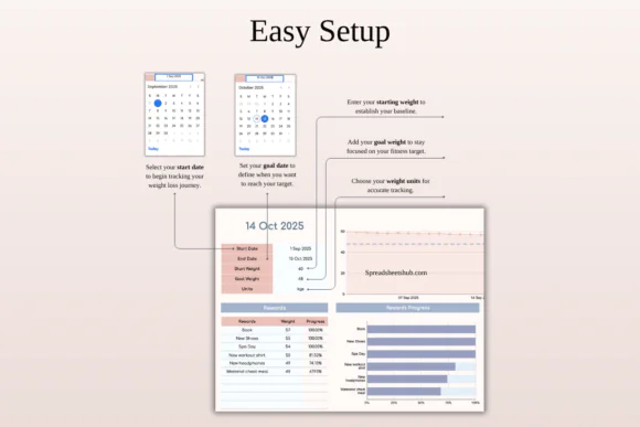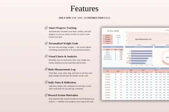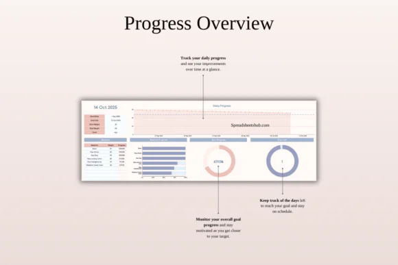 Whether you are just starting your weight loss journey, improving your fitness routine, preparing for a special event, working with a coach, or building healthier habits, this spreadsheet gives you a clear system to track your progress over time. You can log your weight daily or weekly, choose your own start and goal dates, record body measurements, write daily reflections, and see how close you are to your target.