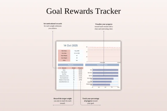The automated charts help you see trends over time, while body measurement tracking gives you a fuller picture beyond the scale. With milestone rewards and reflection notes, this spreadsheet supports both motivation and accountability during your weight loss journey.