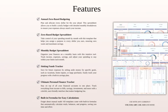 The Annual Zero-Based Budget Spreadsheet gives you a full-year view of income and expenses. The Zero-Based Budget Spreadsheet helps you plan each month with intention by giving every dollar a job. The Monthly Budget Spreadsheet provides a simple income, expense, and savings overview. The Sinking Funds Tracker helps you save ahead for vacations, gifts, large purchases, repairs, holidays, and other future expenses. The Rainbow Theme Personal Finance Tracker adds a colorful dashboard for visual finance tracking.