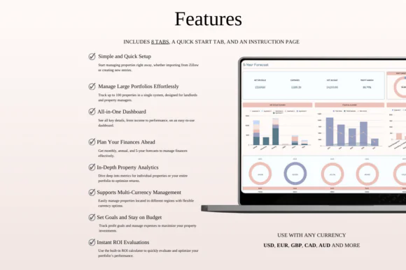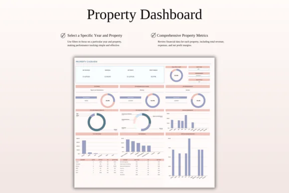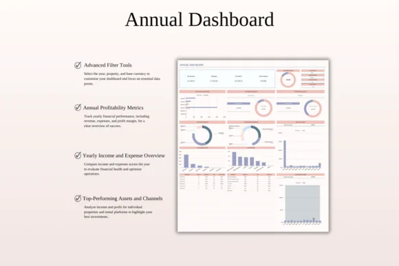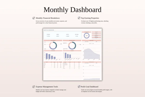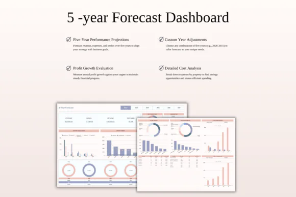 The spreadsheet includes powerful dashboards to help you understand your rental business at a glance. You can monitor monthly income, yearly expenses, top-performing properties, sales channels, profit goals, expense budgets, and long-term growth trends. The included 5-year forecast dashboard gives you a broader view of your property management performance and helps you plan future growth more strategically.