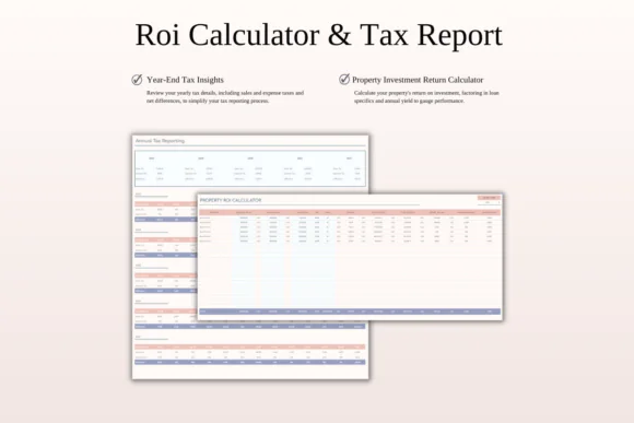 This rental property finance template also includes an ROI calculator and tax report section, making it useful for understanding property yield, purchase scenarios, income, expenses, and tax-related financial summaries. Whether you are tracking rent payments, booking income, maintenance costs, management expenses, utilities, taxes, or other property-related spending, this template helps keep everything organized.