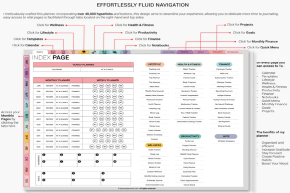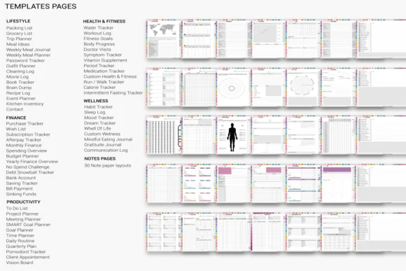 You also get a strong set of finance, wellness, event, travel, and productivity templates. Finance pages cover income and expense tracking, subscription and bill management, and visual spending graphs. Wellness pages include daily habit tracker, sleep and mood logs, gratitude journal, meal planner, and custom wellness templates. Additional sections include wedding planning, event templates, travel preparation, project dashboards, vision boards, brain dump pages, mind maps, and home cleaning or chore routines.