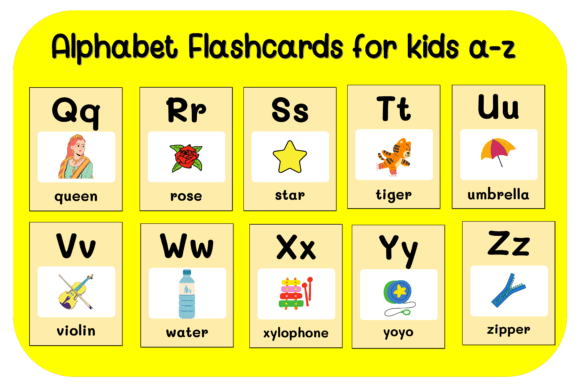 This set includes 26 printable flashcards covering the full alphabet from A to Z, along with 26 words to support vocabulary development and letter recognition. These cards are a helpful resource for teaching children the alphabet in a visual and interactive way, making them perfect for reading practice, classroom games, and early literacy activities.