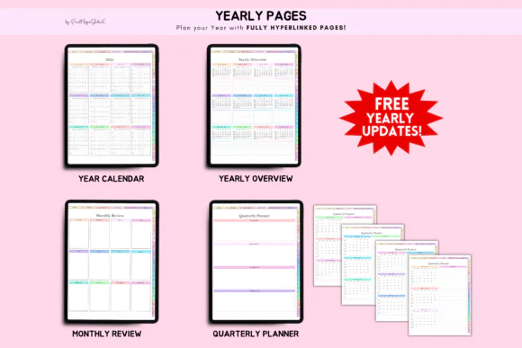 This planner also comes with a variety of notes templates, giving you extra space for journaling, brainstorming, creativity, planning, and productivity. It is made to work with popular annotation apps such as GoodNotes, Notability, Penly, Noteshelf, and Xodo, so you can write, edit, and customize it using your preferred digital planning app.