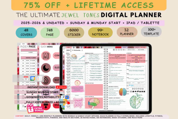 Stay organized with this Digital Planner 2025–2026–2027 - Jewel Tones, a practical digital planning resource created to help you manage your schedule, priorities, notes, and everyday tasks more efficiently. The undated format gives you the flexibility to start anytime and reuse it whenever you want. It also includes planning support for 2025, 2026, and 2027, making it useful for both current and long-term organization.