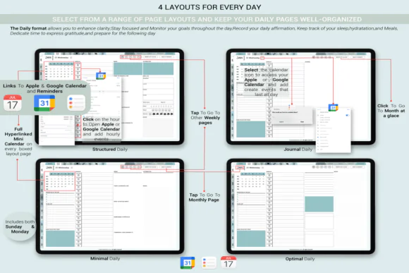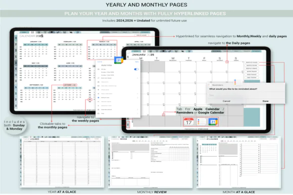 This planner supports Apple Calendar and Reminders integration as well as Google Calendar sync, helping users align their planner with events, schedules, and tasks across devices. It also supports multi-device sync across iPad, iPhone, and Mac within the Apple ecosystem.