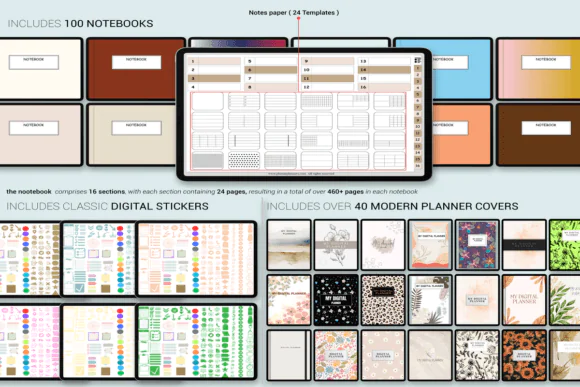 The package includes 6000 digital planners, 48+ stunning covers, 100 digital notebooks, 63+ templates, 10 customizable hyperlinked sections, 10 note page styles, and 6000+ classic digital stickers in multiple color themes. It also includes pre-cropped digital stickers and a centralized dashboard for easier navigation and organization.