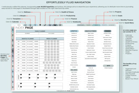 - Lifestyle trackers such as packing list, grocery planner, trip ideas, meal log, weekly meal journal, weekly meal planner, password tracker, outfit planner, cleaning log, book tracker, movie log, brain dump, event planner, kitchen inventory, and contacts