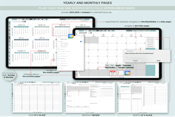 This bundle gives you access to an interactive digital planner builder, allowing you to create your ideal planner in minutes. You can personalize your setup with different orientations, tab colors, weekly and daily layouts, start dates, and cover styles to match your own workflow and design taste. It includes 2024, 2025, 2026, 2027, and undated options, making it a long-term digital planning solution.