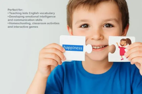Each card features a colorful illustration of a child showing a specific emotion along with the matching English word, making it easier for young learners to connect facial expressions with feelings vocabulary. This set is ideal for preschool, kindergarten, homeschool lessons, classroom language learning, ESL practice, SEL activities, and emotional vocabulary development.