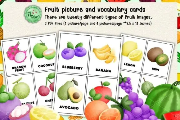 This set features 20 different fruits, making it a helpful resource for preschool, early elementary, homeschool lessons, classroom activities, food vocabulary practice, and early recognition learning. The vibrant illustrations help children stay interested while building vocabulary and connecting fruit names with familiar images in a memorable way.