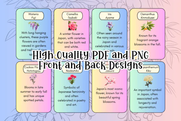 This set includes 8 Japanese flower flashcards across 2 pages, with front and back designs that help make learning more visually rich and memorable. Each flower is paired with a vivid graphic and symbolic meaning, making the set suitable not only for educational purposes but also for cultural learning, nature study, and decorative inspiration.